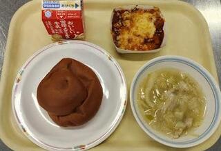 献立:ココアパン 牛乳 ポテトのミートグラタン レンズ豆のスープ産地:〇じゃがいも・・・北海道 〇たまねぎ・・・北海道 〇にんじん・・・千葉 〇セロリー・・・静岡 〇えのき・・・長野 〇キャベツ・・・茨城