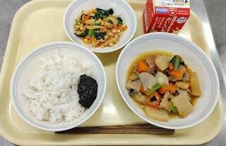 献立:麦ごはん 牛乳 海苔の佃煮 大根と豚肉のべっこう煮 千草和え