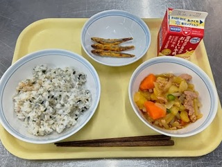 献立:わかめごはん 牛乳 きびなごのから揚げ 肉じゃが産地:〇じゃがいも・・・北海道 〇しょうが・・・高知 〇ねぎ・・・青森 〇にんじん・・・北海道 〇玉ねぎ・・・北海道 〇さやいんげん・・・青森
