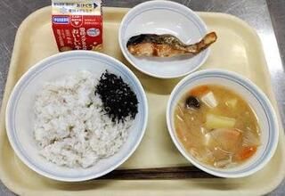 献立:麦ごはん 牛乳 ひじきのふりかけ 魚の照り焼き 豚汁産地:〇じゃがいも・・・北海道 〇しょうが・・・高知 〇ごぼう・・・鹿児島 〇にんじん・・・北海道 〇だいこん・・・青森 〇しめじ・・・長野 〇ねぎ・・・青森