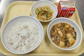献立:麦ごはん 牛乳 麻婆豆腐 中華サラダ産地:〇にんにく・・・青森 〇しょうが・・・高知 〇にんじん・・・北海道 〇たまねぎ・・・北海道 〇ねぎ・・・秋田 〇にら・・・茨城 〇キャベツ・・・長野 〇きゅうり・・・群馬