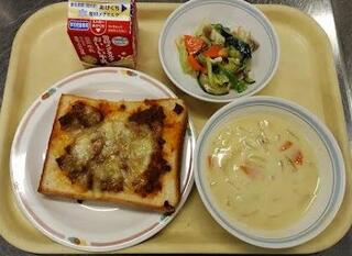 献立:カレーミートトースト 牛乳 コーンスープ ベーコンサラダ産地:〇じゃがいも・・・北海道 〇にんじん・・・北海道 〇玉ねぎ・・・北海道 〇キャベツ・・・岩手 〇きゅうり・・・秋田