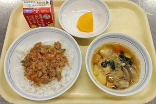 献立:豚丼 牛乳 三平汁 くだもの産地:〇たまねぎ・・・北海道 〇にんじん・・・北海道 〇ねぎ・・・青森 〇えのき・・・長野 〇しょうが・・・高知 〇いんげん・・・群馬 〇だいこん・・・北海道 〇ごぼう・・・鹿児島 〇じゃがいも・・・北海道 〇小松菜・・・埼玉 〇柿・・・奈良