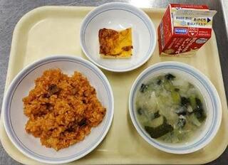 献立:チキンライス 牛乳 洋風卵焼き キャベツとジャガイモのスープ産地:〇にんじん・・・北海道 〇たまねぎ・・・北海道 〇じゃがいも・・・北海道 〇キャベツ・・・長野 〇小松菜・・・茨城