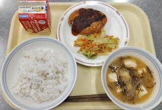 献立:麦ごはん 牛乳 小松菜コロッケ からしあえ もずくのみそ汁産地:〇にんじん・・・北海道 〇たまねぎ・・・北海道 〇じゃがいも・・・北海道 〇小松菜・・・東京 〇キャベツ・・・千葉 〇もやし・・・栃木 〇ねぎ・・・青森