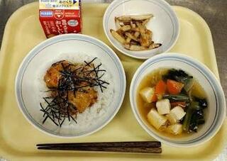献立:つくね丼 牛乳 ごぼうのからあげ すまし汁産地:〇たまねぎ・・・北海道 〇にんじん・・・青森 〇小松菜・・・茨城 〇しょうが・・・高知 〇長ネギ・・・山形 〇大根・・・千葉 〇ごぼう・・・埼玉
