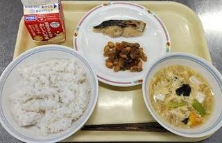 献立:麦ごはん 牛乳 鰆の西京焼き 大豆の五目煮 かきたま汁産地:〇玉ねぎ・・・北海道 〇にんじん・・・千葉 〇小松菜・・・茨城 〇えのき・・・長野 〇ごぼう・・・埼玉