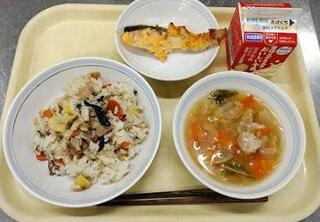 献立:秋の香りごはん 牛乳 鮭の紅葉焼き のっぺい汁産地:〇にんじん・・・千葉 〇しめじ・・・長野 〇小松菜・・・埼玉 〇菊の花・・・山形 〇だいこん・・・千葉 〇さといも・・・埼玉 〇はくさい・・・茨城 〇ねぎ・・・秋田
