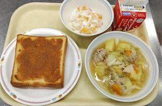 献立:きなこトースト 牛乳 ミートボールスープ フルーツヨーグルトかけ産地:〇にんじん・・・千葉 〇玉ねぎ・・・北海道 〇じゃがいも・・・北海道 〇キャベツ・・・神奈川 〇しょうが・・・高知