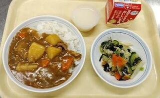 献立:ポークカレーライス 牛乳 じゃこいり海藻サラダ カルピスゼリー産地:〇玉ねぎ・・・北海道 〇にんにく・・・青森 〇しょうが・・・高知 〇にんじん・・・千葉 〇じゃがいも・・・北海道 〇キャベツ・・・愛知 〇きゅうり・・・宮崎