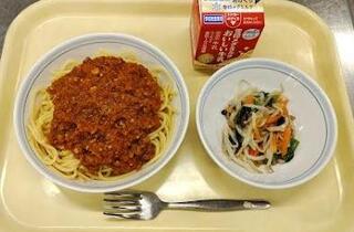 献立:スパゲティ大豆入りミートソース 牛乳 もやしのサラダ産地:〇玉ねぎ・・・北海道 〇にんじん・・・千葉 〇小松菜・・・茨城 〇しょうが・・・高知 〇にんにく・・・青森 〇もやし・・・神奈川 〇セロリ・・・愛知