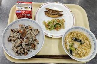 献立:ひじきごはん 牛乳 きびなごのから揚げ みそドレッシングのサラダ かきたま汁産地:〇にんじん・・・千葉 〇しょうが・・・高知 〇ねぎ・・・茨城 〇キャベツ・・・愛知 〇きゅうり・・・群馬 〇もやし・・・神奈川 〇小松菜・・・茨城