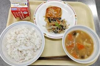 献立:麦ごはん 牛乳 鶏肉のピリ辛焼き もやしとわかめのごま醤油 いものこ汁産地:〇しょうが・・・高知 〇にんにく・・・青森 〇もやし・・・福島 〇にんじん・・・千葉 〇小松菜・・・埼玉 〇さといも・・・埼玉 〇ごぼう・・・青森 〇しめじ・・・長野 〇ねぎ・・・千葉