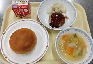 献立:ミルクパン 牛乳 おからいりハンバーグ ジャーマンポテト 野菜スープ産地:〇玉ねぎ・・・北海道 〇じゃがいも・・・北海道 〇にんじん・・・千葉 〇白菜・・・群馬
