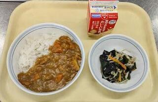 献立:カレーライス 牛乳 じゃこいりわかめサラダ産地:〇玉ねぎ・・・北海道 〇じゃがいも・・・長崎 〇にんじん・・・千葉 〇しょうが・・・高知 〇にんにく・・・青森 〇きゅうり・・・宮崎 〇もやし・・・神奈川
