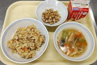 献立:チャーハン 牛乳 中華スープ のり塩ビーンズ産地:〇にんじん・・・千葉 〇長ネギ・・・千葉 〇しょうが・・・高知 〇玉ねぎ・・・北海道 〇青梗菜・・・静岡 〇もやし・・・福島
