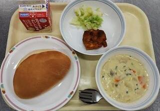 献立:ミルクパン 牛乳 タンドリーチキン ボイルキャベツ コーンスープ産地:〇にんにく・・・青森 〇しょうが・・・高知 〇キャベツ・・・愛知 〇にんじん・・・千葉 〇玉ねぎ・・・北海道 〇じゃがいも・・・北海道 〇パセリ・・・静岡