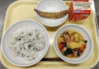 献立:わかめごはん 牛乳 鶏肉とじゃがいもの煮物 ししやものごま焼き産地:〇にんじん・・・千葉 〇玉ねぎ・・・北海道 〇じゃがいも・・・北海道 〇小松菜・・・埼玉