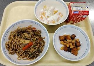 献立:焼きそば 牛乳 ビーンズポテト フルーツヨーグルトかけ産地:〇にんじん・・・千葉 〇玉ねぎ・・・北海道 〇キャベツ・・・愛知 〇もやし・・・栃木 〇じゃがいも・・・長崎