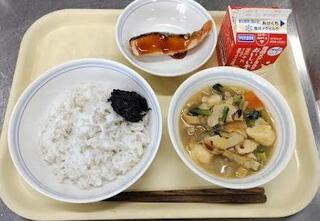 献立:麦ごはん 牛乳 海苔とひじきの佃煮 魚の照り焼き すいとん産地:〇しょうが・・・高知 〇だいこん・・・徳島 〇にんじん・・・千葉 〇白菜・・・茨城 〇ねぎ・・・千葉 〇小松菜・・・東京