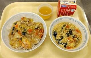献立:中華丼 牛乳 にらたまスープ りんごゼリー産地:〇にんにく・・・青森 〇しょうが・・・高知 〇にんじん・・・千葉 〇玉ねぎ・・・北海道 〇白菜・・・茨城 〇もやし・・・栃木 〇青梗菜・・・静岡 〇えのき・・・長野 〇にら・・・栃木