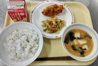 献立:麦ごはん 牛乳 魚のコーンフレーク揚げ おかかあえ みそ汁産地:〇キャベツ・・・神奈川 〇もやし・・・福島 〇にんじん・・・千葉 〇長ネギ・・・千葉 〇じゃがいも・・・鹿児島