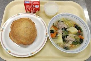 献立:ビスキュイパン 牛乳 ポトフ カルピスゼリー産地:〇セロリー・・・静岡 〇にんじん・・・千葉 〇玉ねぎ・・・北海道 〇しょうが・・・高知 〇じゃがいも・・・鹿児島 〇キャベツ・・・愛知 〇小松菜・・・東京