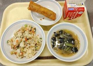 献立:とり五目御飯 牛乳 きのこ春巻き 味噌汁産地:〇ごぼう・・・青森 〇にんじん・・・千葉 〇いんげん・・・沖縄 〇しょうが・・・高知 〇にんにく・・・青森 〇えのき・えりんぎ・・・長野 〇シイタケ・・・栃木 〇もやし・・・栃木 〇玉ねぎ・・・北海道 〇じゃがいも・・・鹿児島 〇小松菜・・・東京