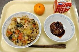 献立:海鮮あんかけ焼きそば 牛乳 じゃが丸揚げ くだもの産地:〇にんにく・・・青森 〇しょうが・・・高知 〇にんじん・・・千葉 〇玉ねぎ・・・北海道 〇白菜・・・茨城 〇しいたけ・・・栃木 〇エリンギ・・・長野 〇青梗菜・・・茨城 〇じゃがいも・・・鹿児島 〇ねぎ・・・千葉 〇みかん・・・静岡