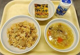 献立:ジャンバラヤ ジョア チーズ入りオムレツ マカロニスープ産地:〇玉ねぎ・・・北海道 〇にんじん・・・千葉 〇しょうが・・・高知 〇セロリー・・・愛知 〇しめじ・・・新潟 〇白菜・・・茨城 〇パプリカ・・・茨城 〇ピーマン・・・宮崎 〇ほうれん草・・・茨城
