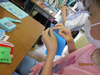 基本のなみ縫いや返し縫い、玉止め、玉結びなど、一生懸命に練習をしています。今後の学習では、布を使った小物を作成する予定です。ここで身に着けた知識を生活に役立ててほしいと思っています。