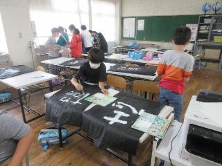 表現運動発表会で使用する衣装の作成を行いました。5年生はソーラン節を踊る際に、はっぴを着用します。黒色のはっぴの背中部分に、白色のアクリル絵の具で漢字を一文字書きました。