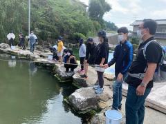松井農園に到着した子供達。 さっそくニジマス釣りを始めました。 餌をつけられない 魚がさわれない 釣りなんてやらなければ… そんな声もチラホラ聞こえてくる中でのスタートでしたが、始まってしまえばみんな夢中で魚釣りを楽しんでいました。 男女が自然と協力し合い、魚が釣れた時はどの子も最高の笑顔で楽しんでいました。