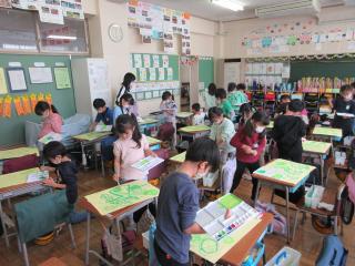 図工の学習であさがおの作品作りをしています。初めに、自分の育てたあさがおの写真を見ながら葉やつるの輪郭をクレパスで描いて、その次に絵の具で丁寧に色を塗りました。絵の具や水の量を考えて、色の濃さを調整しながら塗っていました。そして、今後作成する花を貼り付けて完成です。子どもたちは、とても集中して一生懸命作品を作っていました。この作品は、3学期に行われる展覧会で展示する予定です。完成を楽しみにしていてください。