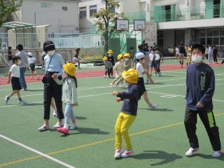 1年生を迎える会が終わってからは、中休みの時間に外で遊ぶことができるようになりました。友達と走り回ったり、遊具で遊んだりしながら、黄色い帽子をかぶって楽しく過ごしています。