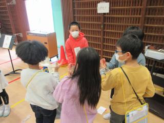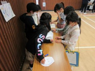 3月1日、2日に2年生と一緒に昔遊びを行いました。各クラスごとに分かれて、2年生から8~9種類の遊びを紹介してもらいました。遊びのコーナーに分かれると、2年生がまず遊び方をして説明してくれて、その後に教えてもらいながら体験をしました。わかりやすい説明や、歌の歌詞カードなどが壁にはってあり、とても工夫された紹介に、1年生はじっくりと聞き入っていました。「こういう風に紹介するといいね。」「歌があると遊びやすいね。」などと言いながら、時間ぎりぎりまで楽しく過ごすことができました。
