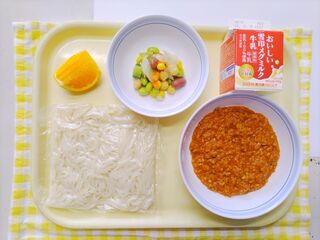 その3 ソフト麺、大豆入りミートソース、ビーンズサラダ、果物