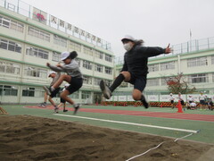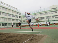 4年生の体育では、走り幅跳びと跳び箱運動を行っています。 走り幅跳びでは、「ドンギュバーン」の助走のリズムや、足をひきつける空中姿勢、「ん」の形での着地を意識しながら取り組んでいます。ゴムひもや新聞紙をつめた袋を跳び越える練習を重ねる中で、跳べる距離が少しずつ伸びてきました。跳び方が上手な友達の様子をよく見ることで、どうしたらより遠くへ跳べるのかを考えている子もいました。