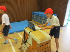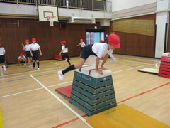 跳び箱運動では、開脚跳びに加えて、かかえこみ跳びや台上前転にも挑戦しています。走り幅跳びと同様に、助走と踏切のリズムを意識しながら取り組みました。また、自分たちの動きを動画にとって確認し、どこをどのように直したらよいのかを客観的に捉えながら練習に励んでいます。