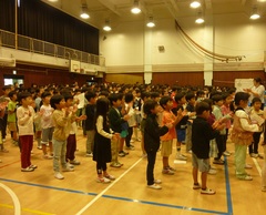 今日の音楽朝会では、ピアノの前奏から歌に入るタイミングや、1年生の代表児童が言ってくれるセリフ、手拍子を合わせる練習をしました。