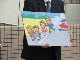 まず、パネルを使って「道路の歩き方」「横断歩道の渡り方」を復習しました。1学期に行った歩行訓練の内容を覚えている児童が多く、「毎日やっているよ!」「平和の森公園に行くときに、手を挙げて横断歩道を渡ったよ。」と自信満々に答えていました。