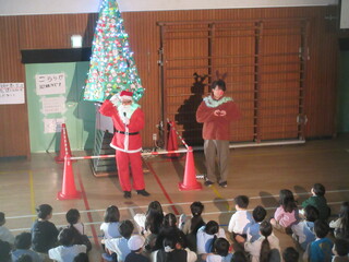 体育館に全学年で飾りをつくったクリスマスツリーを前に、みんなで歌ったのは、「あわてんぼうのサンタクロース」「赤鼻のトナカイ」「ジングルベル」の3曲でみんなが楽しい気持ちで歌を歌うことができました。
