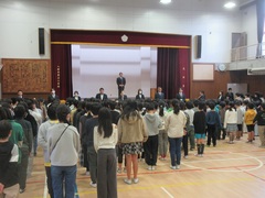 本日は二学期の終業式でした。校長先生から、「みなさん、勉強やスポーツ、学芸会などよく頑張りました。」と労いの言葉をかけてもらい、こどもたちはにっこり笑顔でした。代表児童の「二学期がんばったこと」は、2年生の児童が立派に発表してくれました。最後に6年生の代表児童の指揮で校歌を歌って締めくくりました。その後、各クラスに戻って、通知表をもらったり、大掃除をしたりしました。長かった二学期、本当にお疲れさまでした。