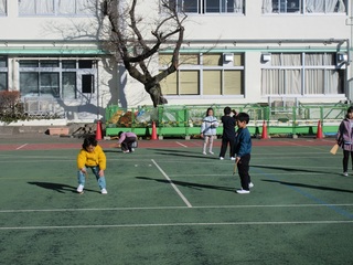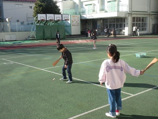 今回は、校庭で竹馬、けん玉、こま、お手玉、羽根つきをしました。