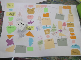 まずは楽しく遊ぶためにはどのようなゲームにするか内容を考えます。次は色画用紙を様々な大きさや形に切り、台紙に貼っていきます。ポイントは形や色の組み合わせ方を考えて貼ることです。スタートからゴールまで色画用紙を貼ったら、マスにコマを進めていく時の内容を書いていきます。こどもたちは、考えそして悩みつつ「1回休み」「スタートまで戻る」「3コマ進む」などの楽しく遊ぶための内容を書いていきます。