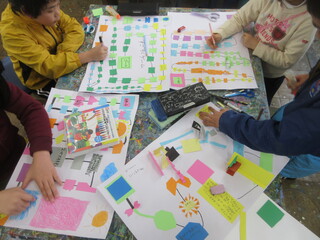 もっと楽しいゲームにするにはどうしたらいいか考えながら「〇〇先生のモノマネをする」「歌をうたう」というのはどうだろう?友だち相談しながらお互いの活動や作品のよさを見合いすごろくゲームづくりに取り組んでいました。