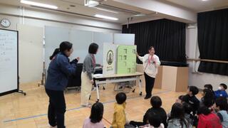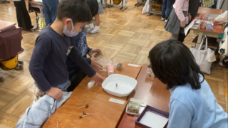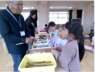 次に、多目的室で環境マイスターの方々のサポートのもと、一人一人が思い描いたおもちゃづくりに取り組みました。マイスターの方々の温かい支援のもと、無事におもちゃを完成させることができました。