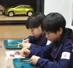 シルクスクリーンという技法で、刷るのに少し力が必要でしたが、担任や介添員と一緒に、ぐーっと力と思いを込めてがんばりました。