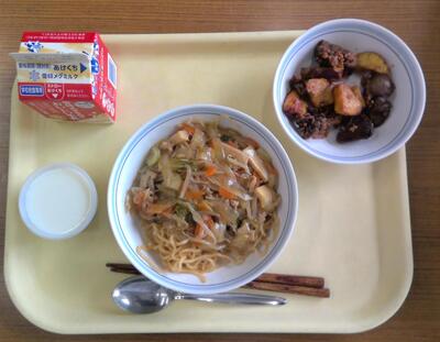 2月は、6年生のリクエスト給食月間でした。2月26日は、「あんかけ焼きそば」と「レバーとさつま芋の甘辛あえ」