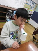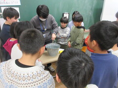 総合的な学習の時間に、音の出る楽器や自分たちの体を見たり触ったりしながら観察して「音のふしぎ」を探求しました。鳴っているトライアングルを水面につけたときに、水がトライアングルの振動に合わせてブルブルと震える様子を見て驚きつつも、「音がするとき、物は振動している」ことを発見しました。その後も、音=振動の仕組みを生かして、自分の声で蛇が動き出すおもちゃを作って、音の正体をより身近に感じて理解していました。